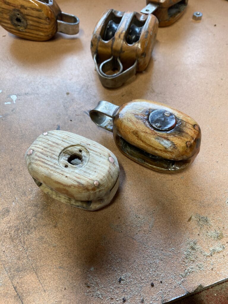 De katrollen! ze rollen nier meer goed en zijn niet meer netjes zoals ze horen, dus nieuwe lak en de assen bij sommige en de afdekdopjes